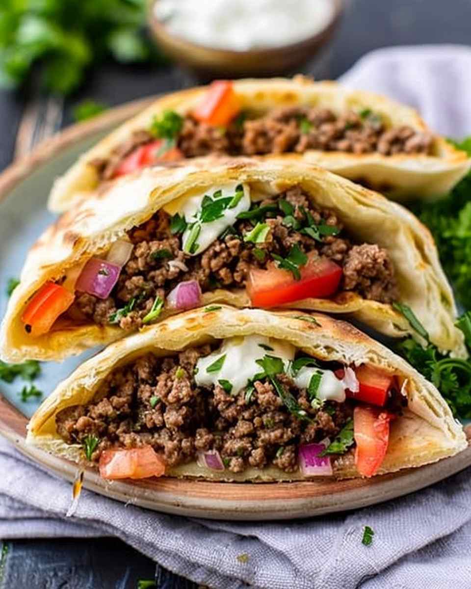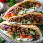 Quick and flavorful Mediterranean ground beef pita pockets filled with seasoned beef, fresh vegetables, and creamy sauce for a satisfying and balanced meal.