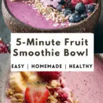This 5-minute fruit smoothie bowl is a thick, creamy blend of frozen fruit and yogurt topped with colorful, nutritious toppings. It’s refreshing, customizable, and perfect for a quick breakfast or energizing snack.