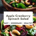 Apple Cranberry Spinach Salad is a fresh and vibrant salad featuring crisp apples, sweet dried cranberries, baby spinach, toasted nuts, and creamy cheese, all tossed in a tangy vinaigrette. It’s quick to prepare, versatile, and perfect as a side dish or a light meal.