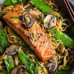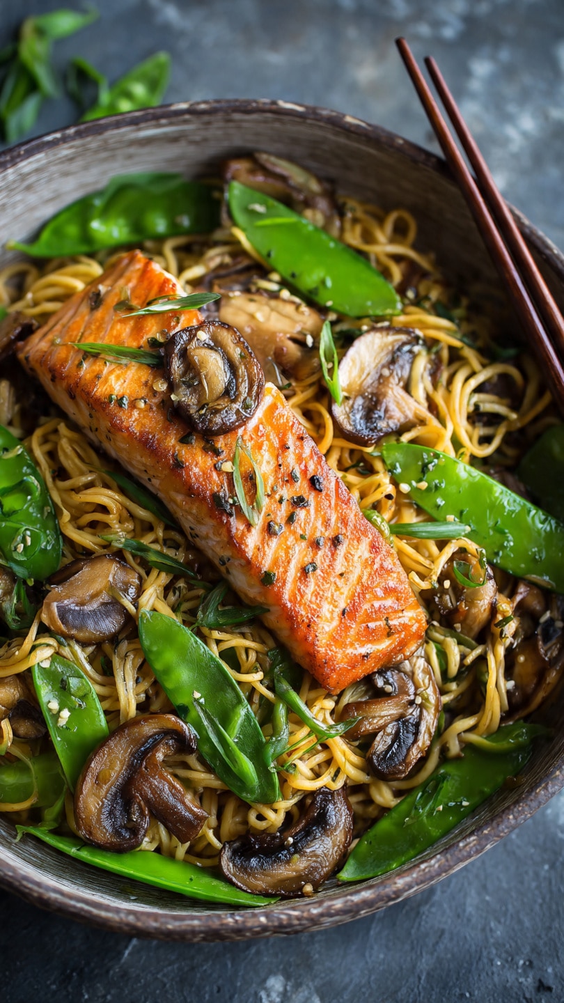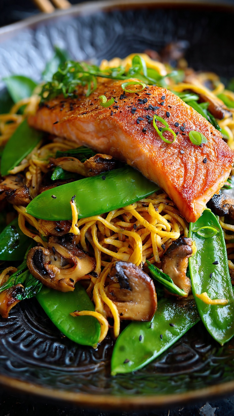 Asian Salmon and Noodles with Mushrooms and Snow Peas is a quick, nourishing stir-fry-style dish packed with bold flavor. Tender chunks of seared salmon, sautéed mushrooms, and crisp snow peas are tossed with noodles and a savory-sweet sauce for a satisfying dinner ready in under 30 minutes.