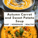 Autumn Carrot and Sweet Potato Soup is a cozy, creamy, and naturally sweet soup made with root vegetables, warming spices, and fresh herbs. This vegetarian (and optionally vegan) soup is perfect for fall and ideal for meal prep, chilly nights, or holiday starters.