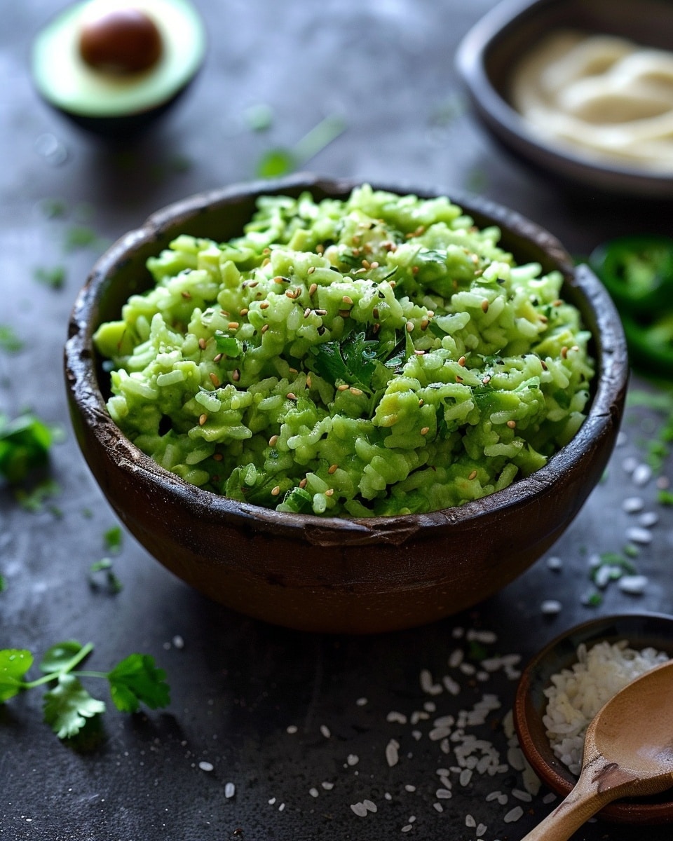 - Gently fold the avocado mixture into the warm rice until creamy and well combined.