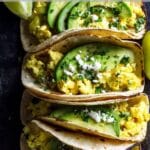 I recommend making these tacos fresh, but if I have leftovers, I store the components separately in the fridge for up to 2 days. I reheat the eggs gently in a skillet or microwave and assemble the tacos when ready to eat. I slice fresh avocado just before serving to keep it from browning.