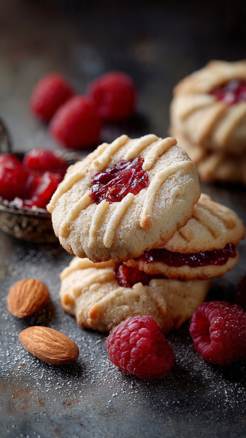 These Festive Raspberry-Filled Almond Cookies are the perfect blend of buttery, nutty, and fruity. I love baking them around the holidays — or anytime I want something sweet and elegant. The soft almond-flavored cookies cradle a bright pop of raspberry jam, and the delicate dusting of powdered sugar gives them a beautiful, snowy finish.