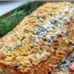 I bake the salmon for 12–15 minutes, depending on the thickness, until it flakes easily with a fork and the cheese is melty and golden.