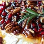 An elegant yet easy baked brie appetizer topped with honey balsamic cranberries, crunchy pecans, and fresh pomegranate arils for a warm, sweet, and tangy centerpiece.