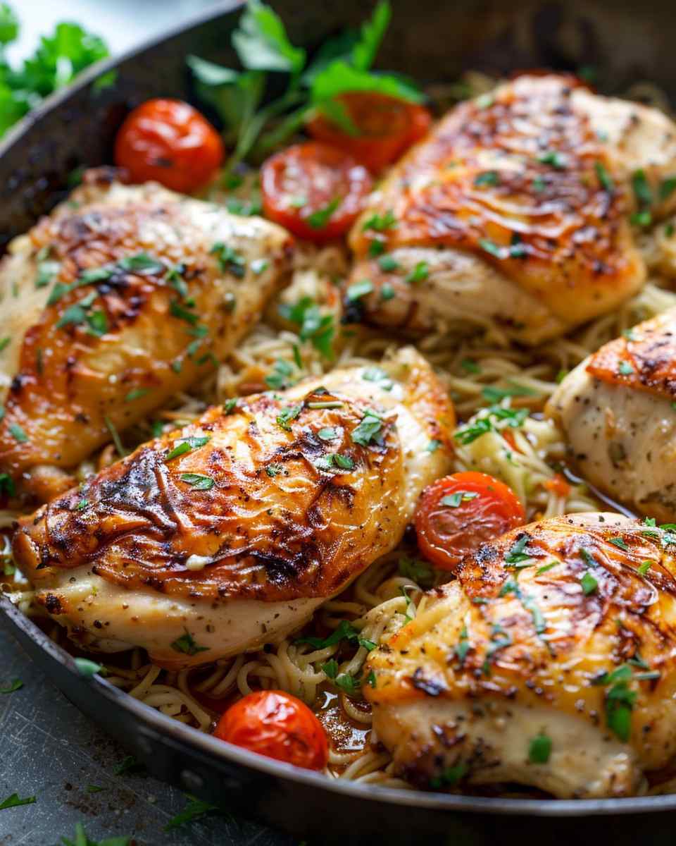 - Bake for 25–30 minutes until the chicken is cooked through and tomatoes are soft.