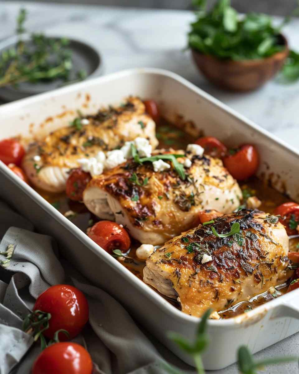 A simple yet flavorful baked feta chicken dish where creamy, tangy feta melts with juicy chicken and roasted tomatoes to create a rich, comforting one-pan meal.