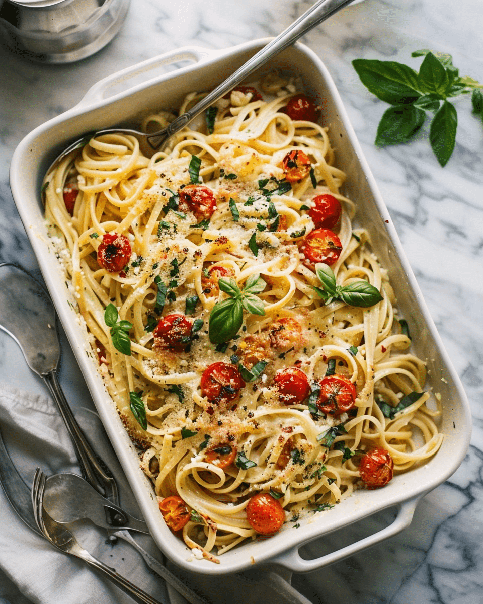 I love how effortlessly this recipe delivers big flavor. It only takes a handful of pantry staples and a single baking dish, but the result feels like something from a restaurant. The oven does most of the work—melting the cheese, roasting the tomatoes, and infusing the whole dish with rich, herby goodness. It’s also endlessly customizable with whatever pasta or veggies I have on hand, which makes it a great last-minute dinner solution.