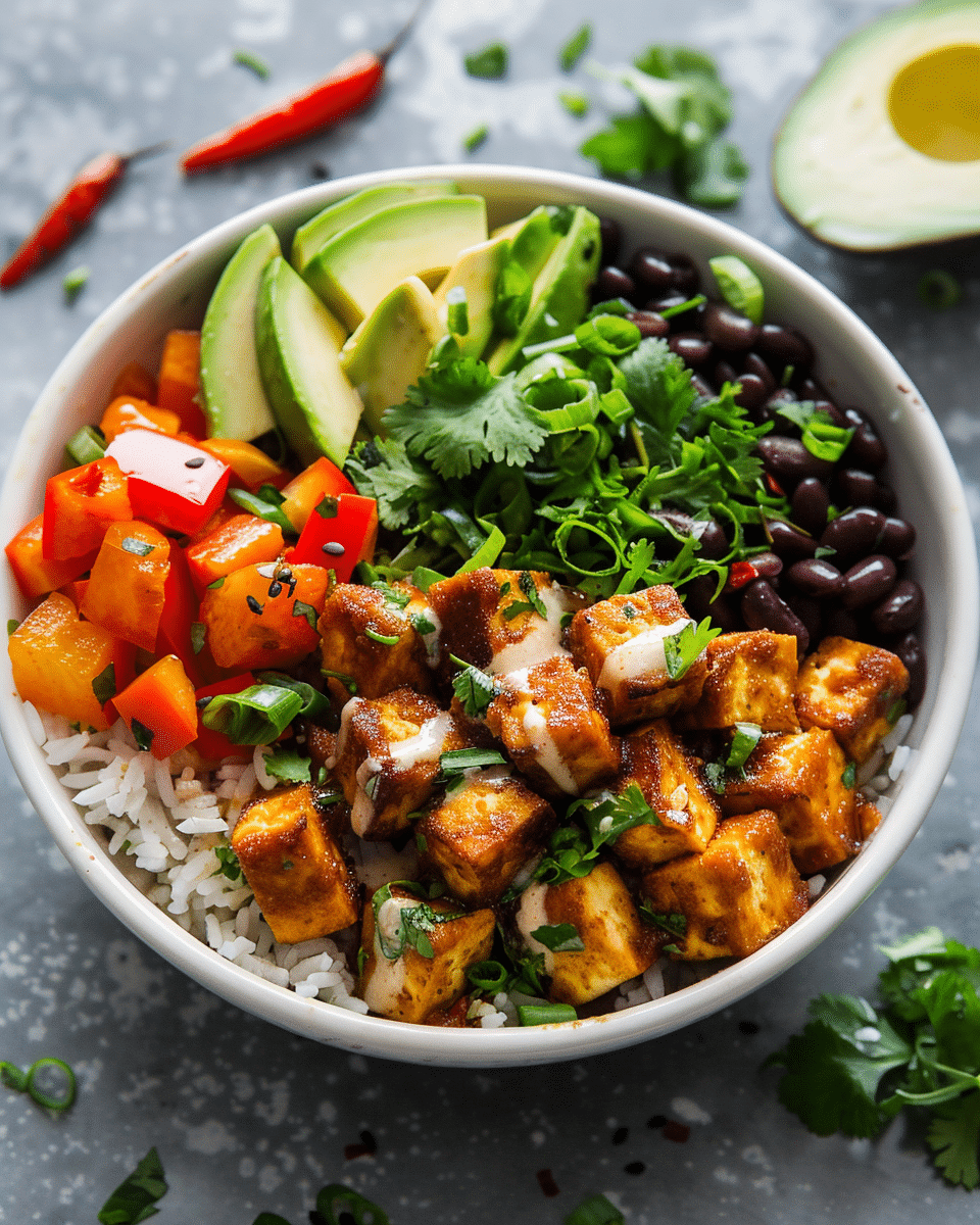 This baked tofu burrito bowl is a hearty, protein-packed meal that’s bursting with color and flavor. It features crispy seasoned tofu, fluffy rice, beans, and fresh toppings like avocado, salsa, and corn—all layered into a bowl that satisfies every craving. It’s a healthy, plant-based option that doesn’t skimp on taste.