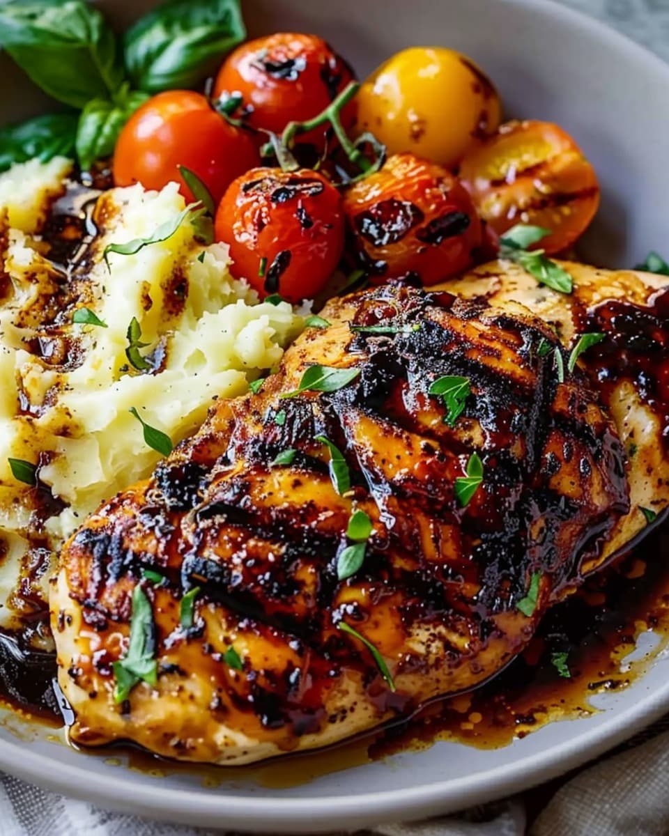 Balsamic Grilled Chicken with Herbed Mashed Potatoes & Roasted Tomatoes is a flavorful, wholesome meal featuring tangy, grilled chicken, creamy herb-infused potatoes, and sweet, caramelized roasted tomatoes. It’s elegant enough for guests but easy enough for weeknights.