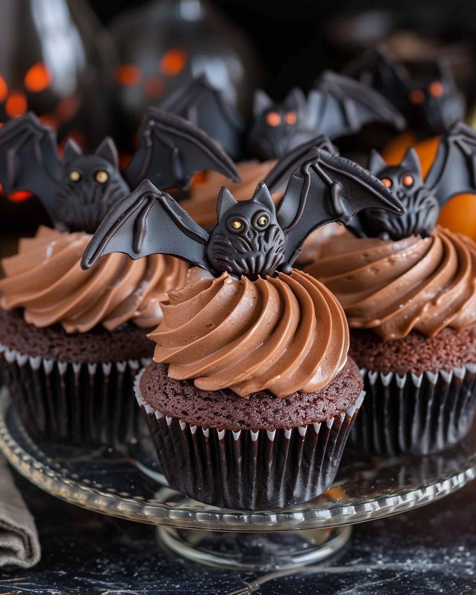I insert two cookie “wings” into the frosting on each cupcake at angles to look like bat wings. Then I press two candy eyes into the center, and optionally, a small candy for a nose. - Chill or serve