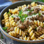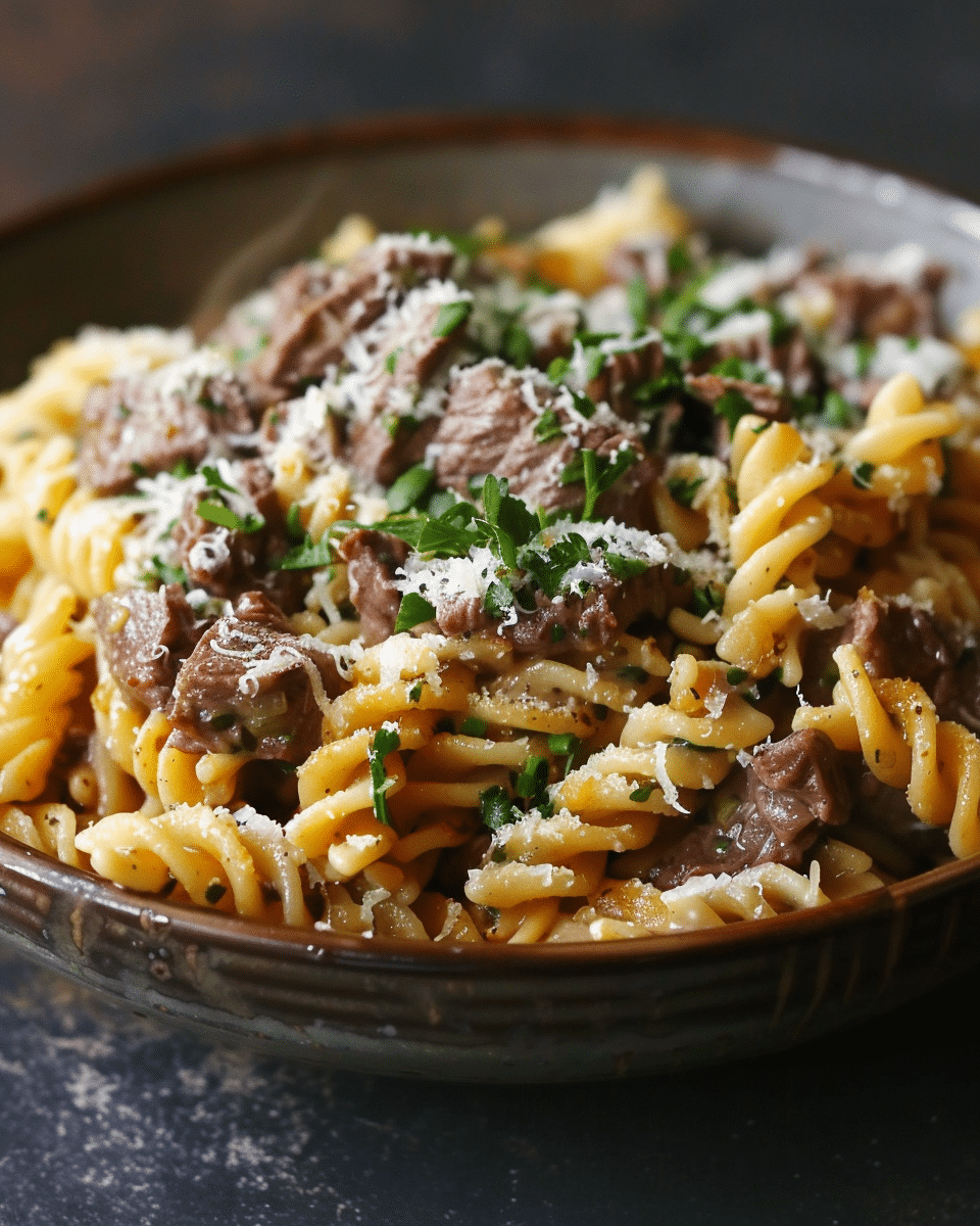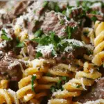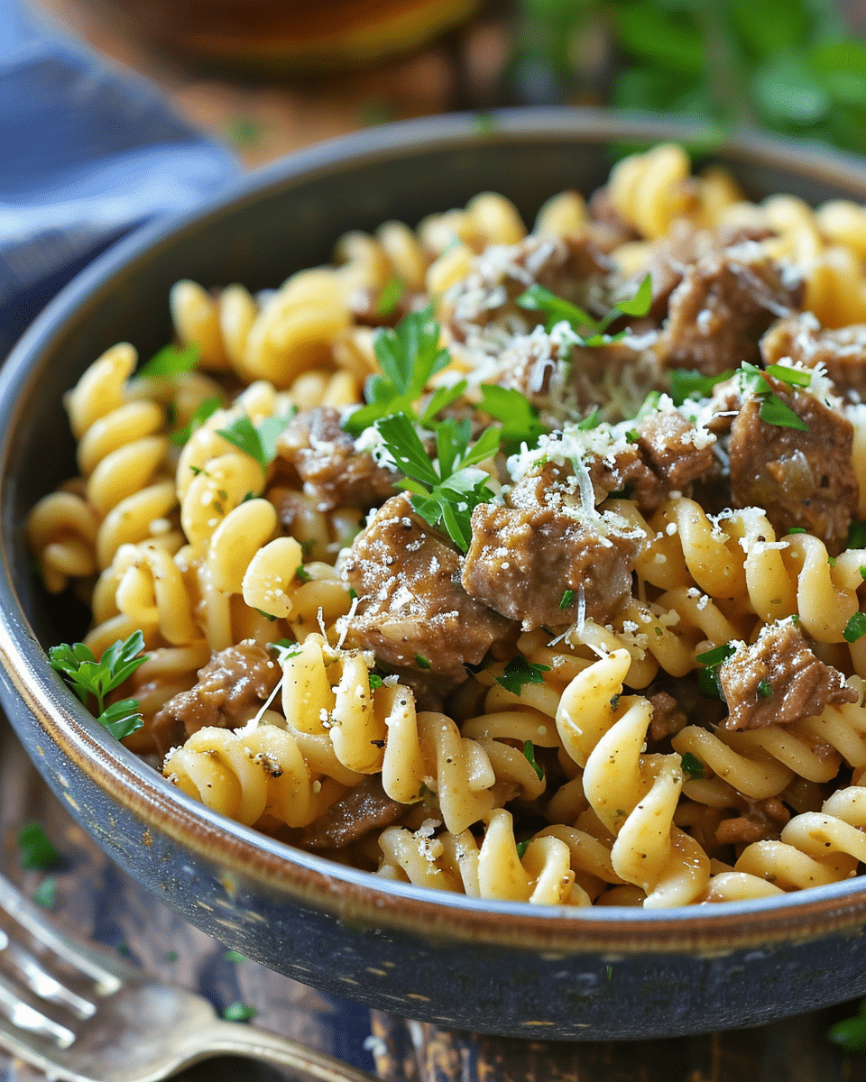 Beef and Rotini in Garlic Parmesan Sauce is a creamy, comforting one-pan pasta dish featuring tender beef, rotini pasta, and a rich garlic-Parmesan sauce. Perfect for weeknight dinners or cozy family meals.