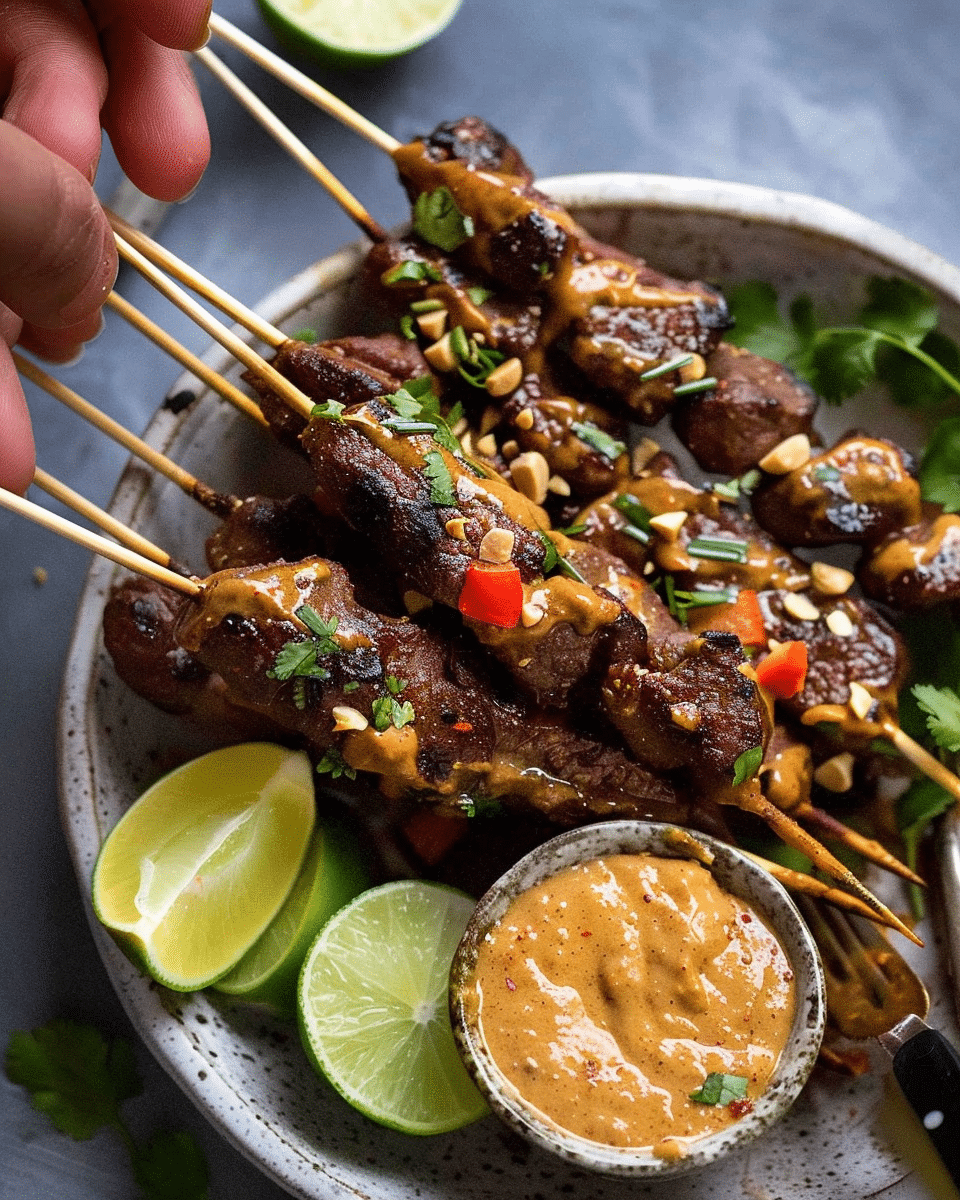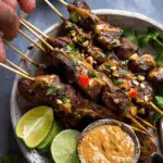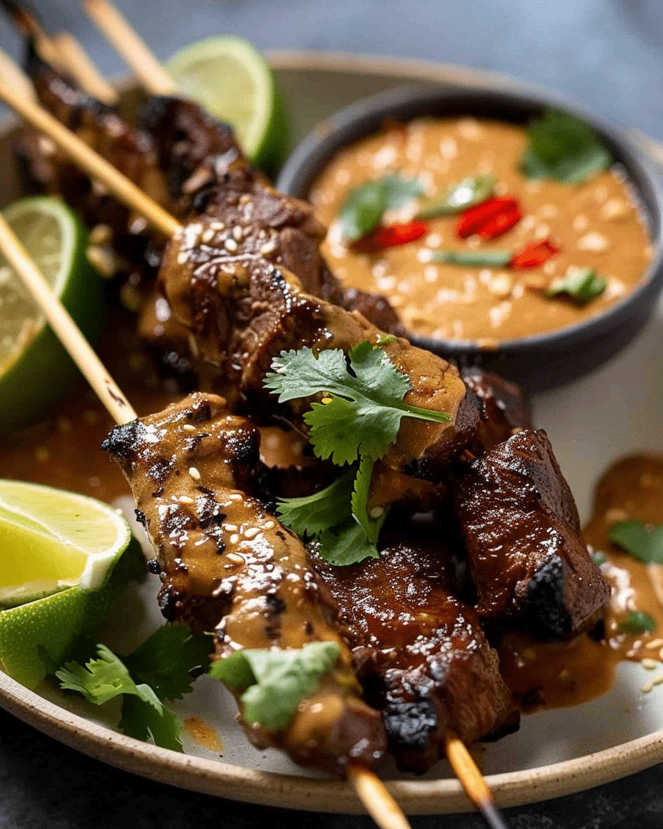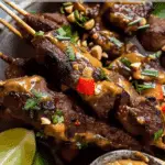 Beef satay with Thai peanut sauce features tender, marinated strips of beef grilled or pan-seared to perfection and served with a creamy, spicy-sweet peanut sauce. A bold and satisfying dish that’s perfect as an appetizer or full meal.