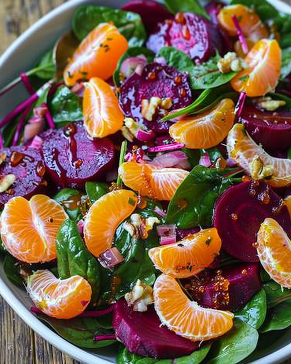 Beet Salad with Spinach, Mandarins, and Honey-Mustard Lemon Dressing