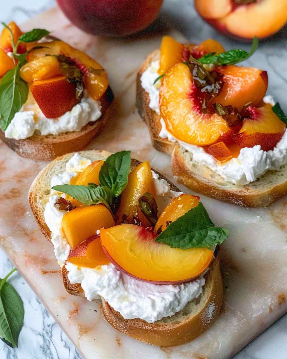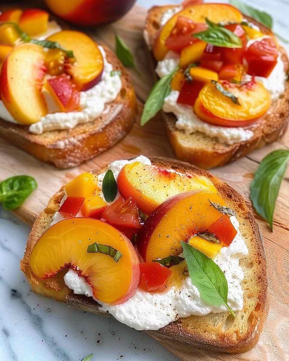 A fresh and elegant peach bruschetta topped with creamy whipped ricotta, juicy peaches, and a hint of honey and basil, perfect for a light summer appetizer.