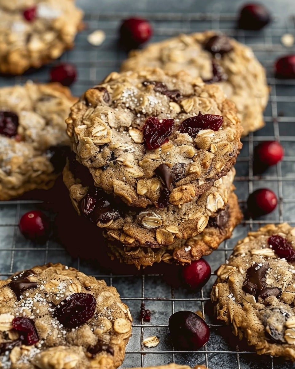 Thick, chewy bakery-style oatmeal cookies loaded with rich dark chocolate and tart dried cranberries for a comforting yet indulgent treat.