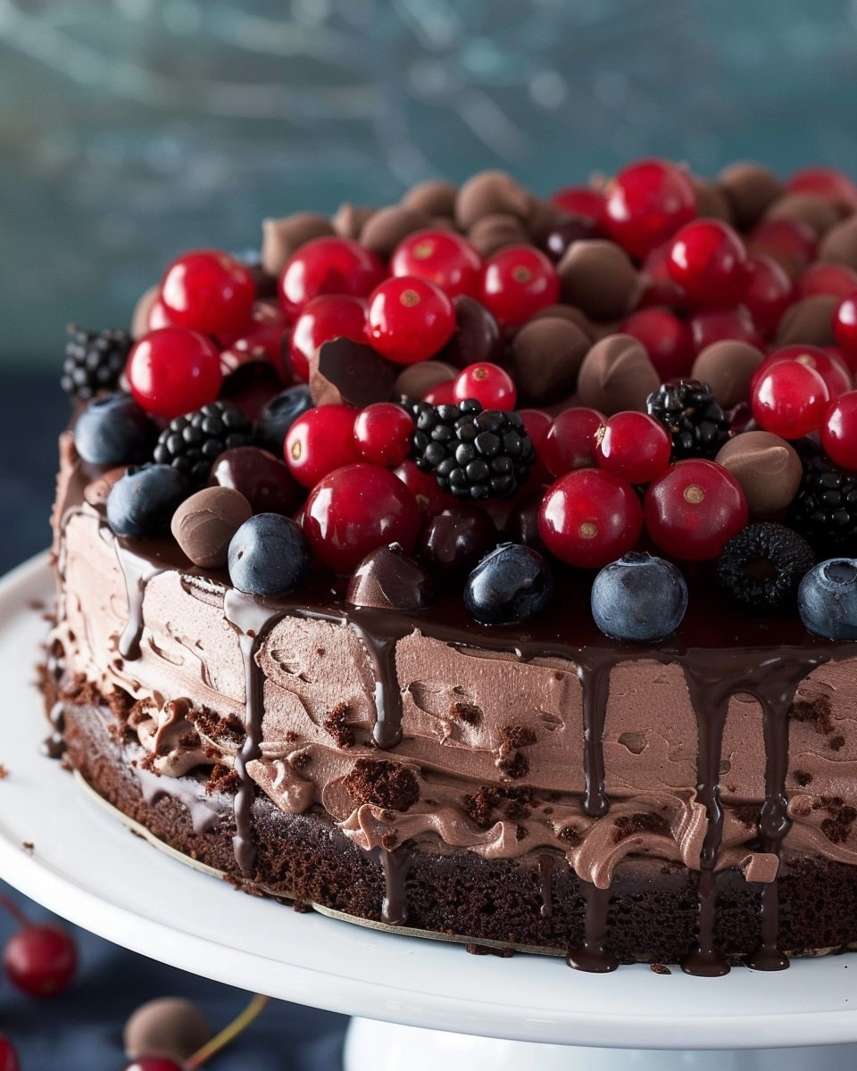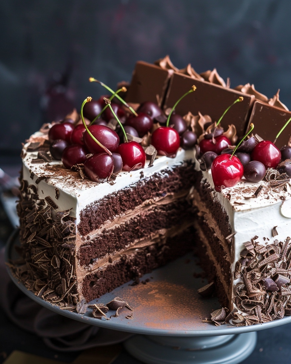 I love this cake because it combines the best of everything: soft chocolate cake, airy mousse, juicy cherries, and a touch of whipped cream or ganache to bring it all together. It’s less sweet than a traditional frosted cake but still rich and satisfying. The contrast between the mousse and cherries makes each bite feel light yet decadent. It’s perfect for special occasions—or anytime I want to treat myself.