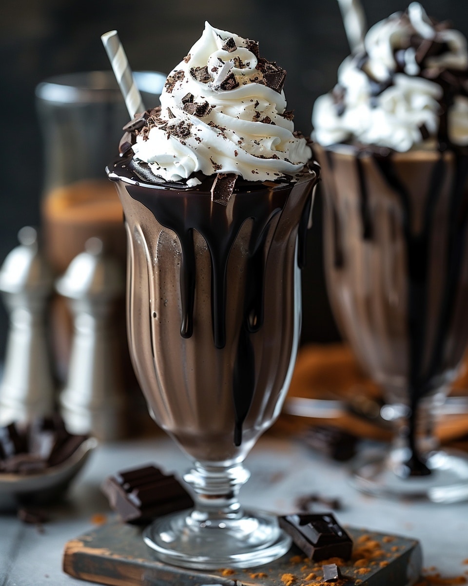 - Drizzle chocolate syrup inside a chilled glass and pour in the milkshake.
