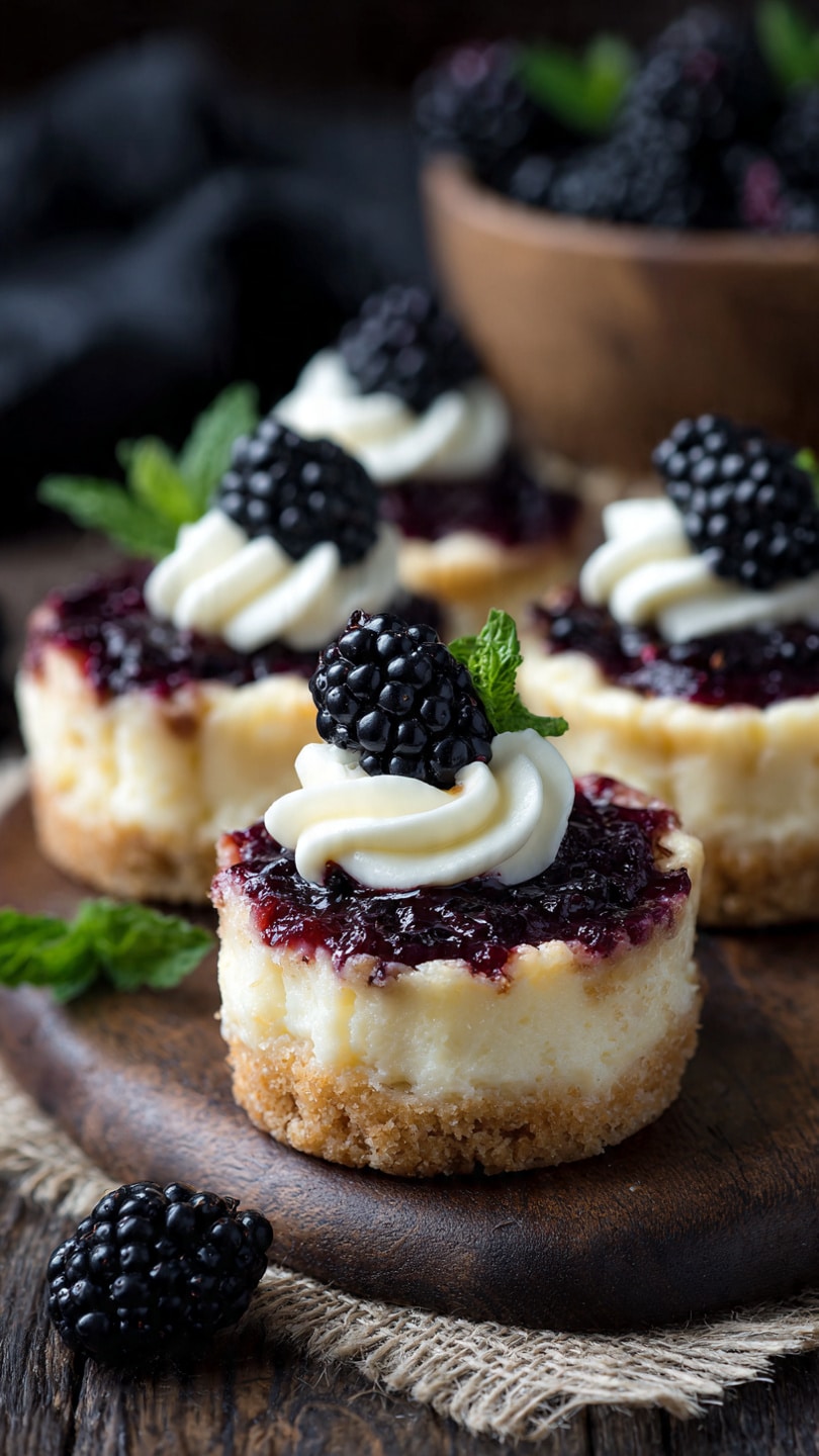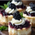 Sweet, creamy mini cheesecakes with a buttery graham cracker crust and topped with fresh blackberries and berry sauce. Perfectly portioned and elegant for any occasion.