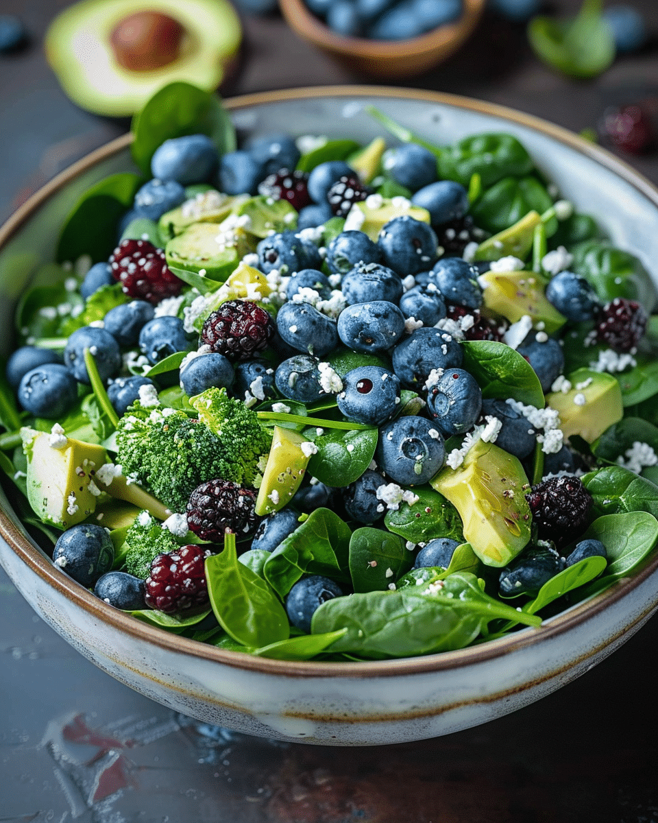 This Blueberry Broccoli Spinach Salad is a vibrant, nutrient-packed dish featuring fresh spinach, broccoli, blueberries, and crunchy nuts, tossed in a tangy vinaigrette. Finished with crumbled feta or goat cheese, it’s perfect as a healthy side, light lunch, or meal prep option.
