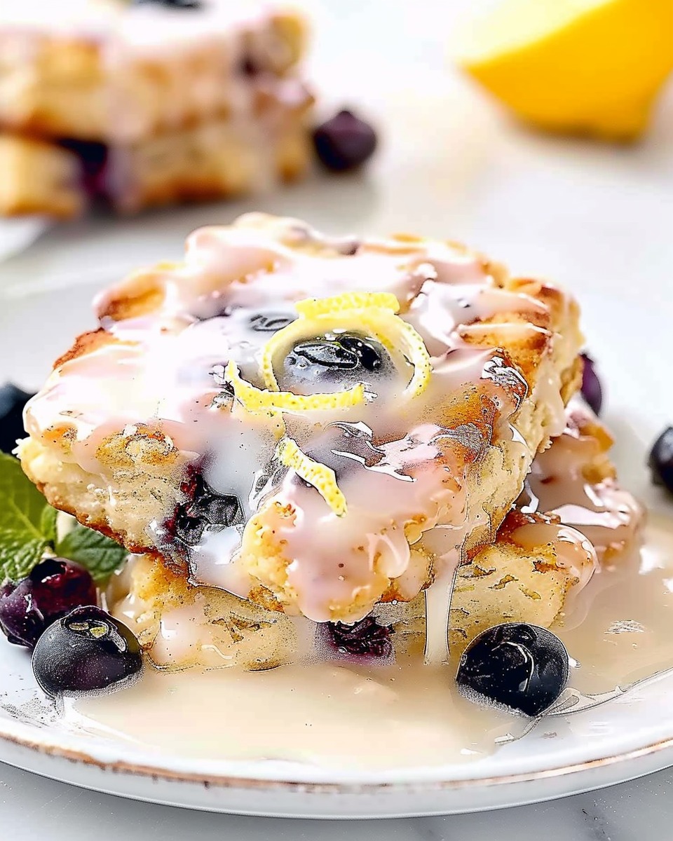 Soft, buttery biscuits baked directly in melted butter and filled with juicy blueberries, then finished with a bright lemon glaze for a cozy yet fresh baked treat.