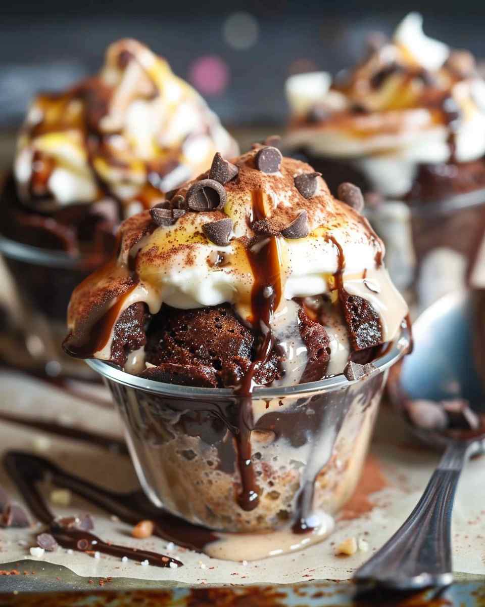 Fudgy brownie cups filled with creamy ice cream and topped with rich sauces and fun toppings, creating a playful and indulgent dessert perfect for any occasion.