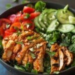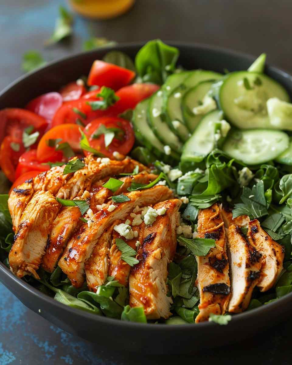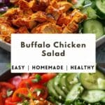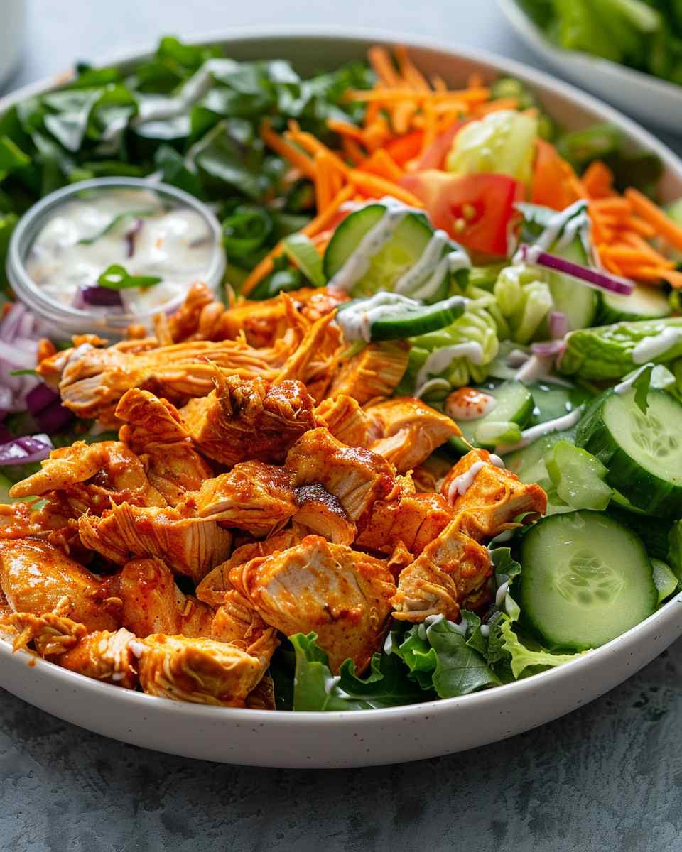 A bold and spicy buffalo chicken salad made with juicy chicken tossed in buffalo sauce, paired with crisp vegetables and a creamy dressing for a satisfying and balanced meal.