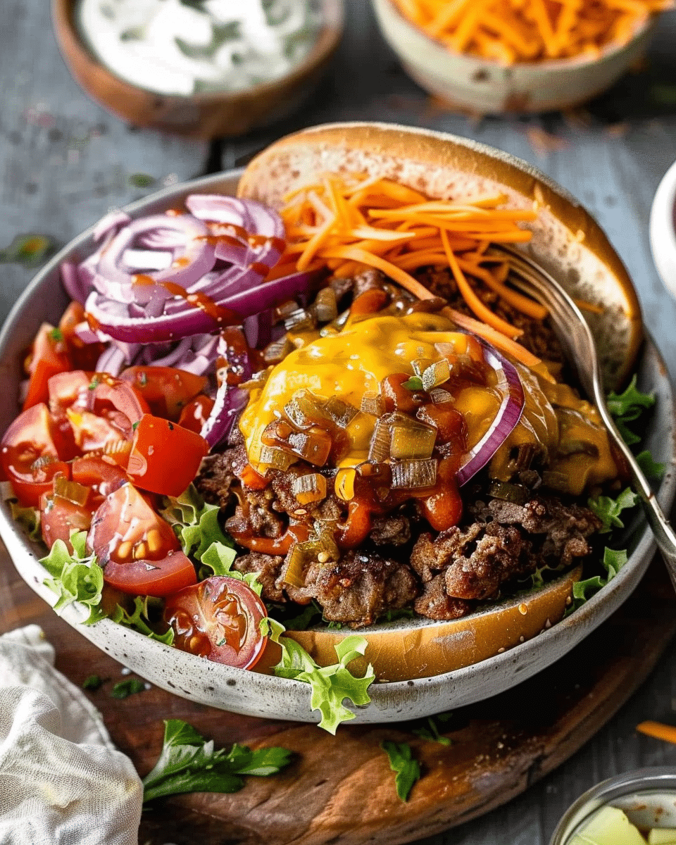 Burger Bowls are a low-carb, bunless twist on the classic burger, served in a bowl and packed with seasoned beef, fresh veggies, cheese, and creamy sauces. This customizable, quick-to-make meal is satisfying, healthy, and perfect for busy nights or meal prep.