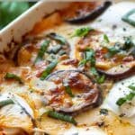 A rich and elegant eggplant parmigiana layered with tender eggplant, sweet caramelized onions, creamy burrata, and a silky parmesan cream for a deeply comforting and indulgent dish.