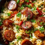 This Cajun Sausage and Rice Skillet is bold, hearty, and full of smoky, spicy flavor. I cook sliced sausage with onions, peppers, and garlic, then stir in perfectly seasoned rice for a one-pan meal that’s satisfying and easy to throw together. It’s my kind of comfort food—simple ingredients, big flavor, and barely any cleanup.
