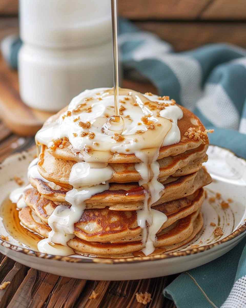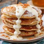 Fluffy carrot cake pancakes infused with warm spices and shredded carrots, topped with a rich and tangy cream cheese syrup for a cozy, dessert-like breakfast.