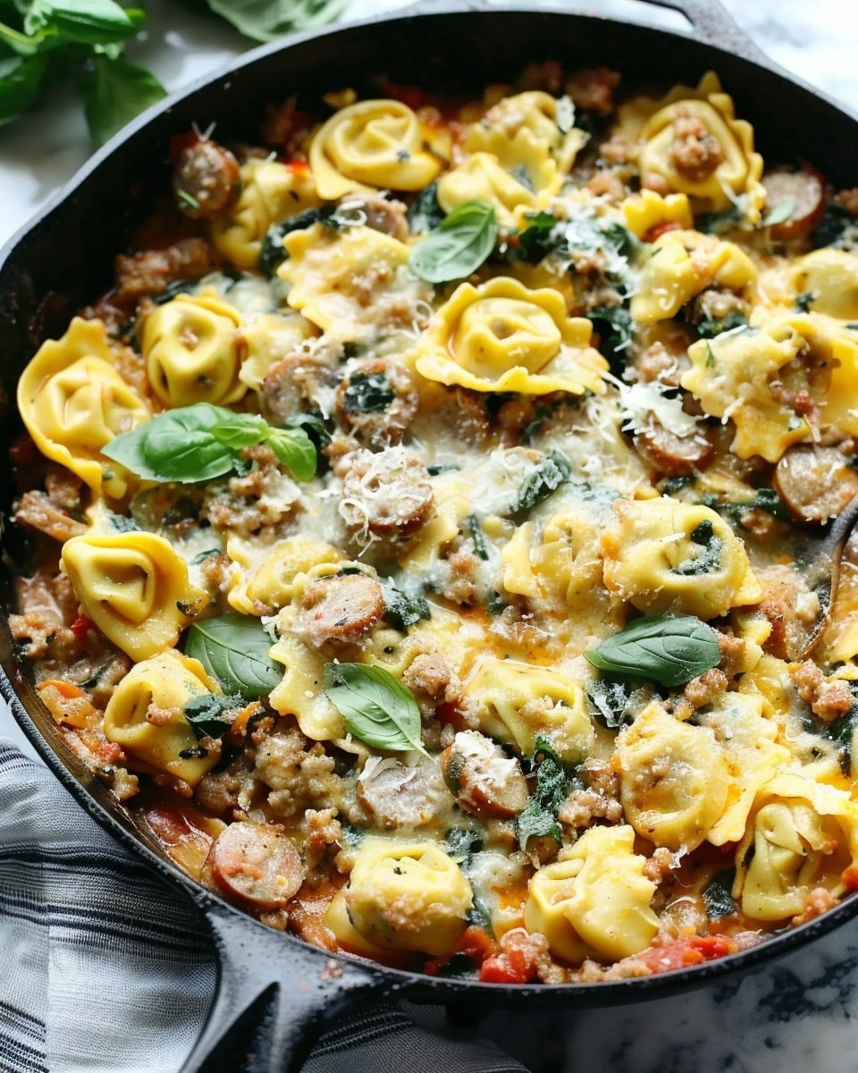 This Cheese Tortellini & Sausage Skillet is a hearty, comforting one-pan meal made with cheesy tortellini, savory beef sausage, and a rich tomato sauce. Ready in under 30 minutes, it’s the perfect family-friendly dinner for busy weeknights.