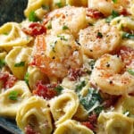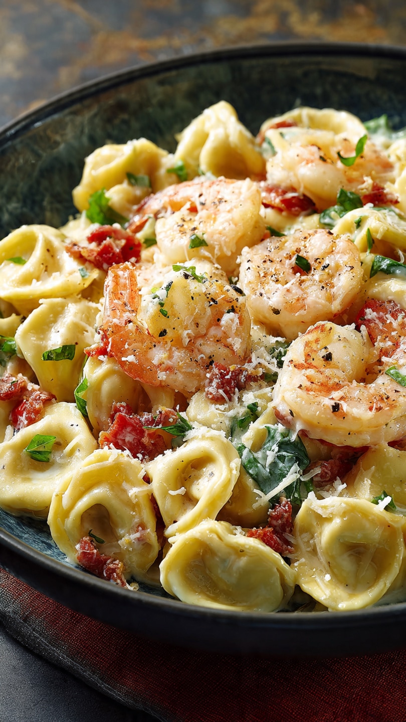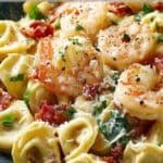 A rich and creamy pasta dish featuring cheese-filled tortellini and tender shrimp tossed in a luscious garlic parmesan Alfredo sauce, perfect for an easy yet elegant meal.