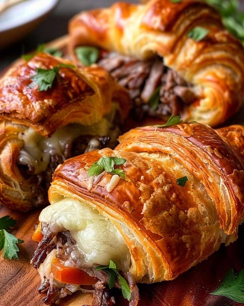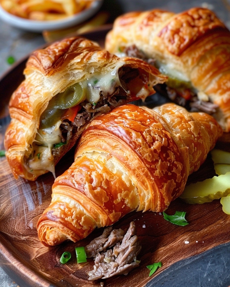 These Cheesesteak Croissants are a mouthwatering twist on the classic Philly cheesesteak, wrapped in buttery, flaky croissant dough. Filled with tender shaved beef, sautéed onions and peppers, and gooey cheese, they make the perfect handheld meal or game day snack.