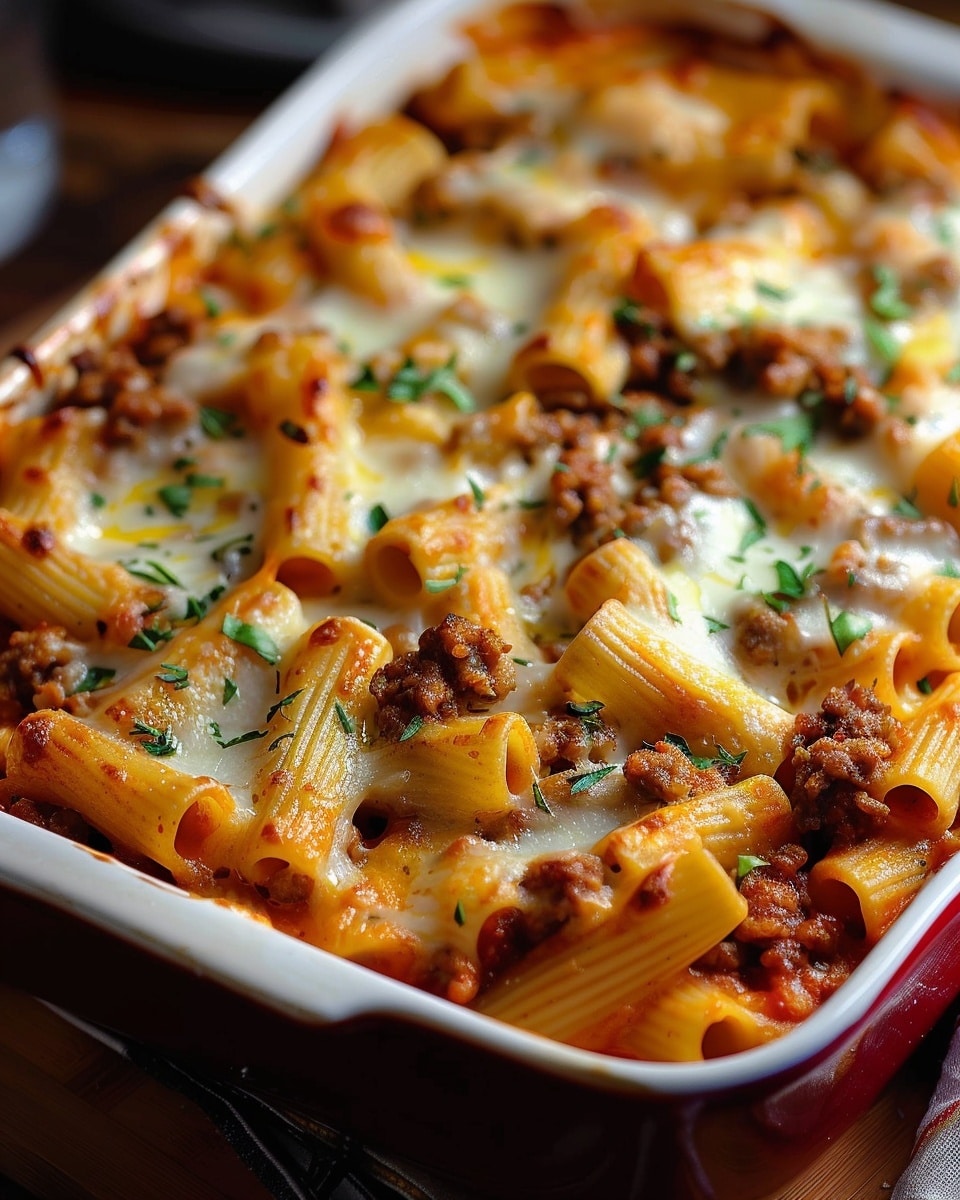 Cheesy Baked Rigatoni with Ground Beef is a hearty, comforting pasta casserole layered with savory meat sauce, melty mozzarella, and Parmesan. Perfect for family dinners, potlucks, or make-ahead meals, this baked rigatoni is rich, satisfying, and freezer-friendly. Serve it fresh from the oven for the ultimate cheesy pasta comfort food.