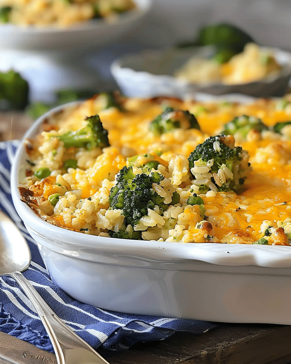 This Cheesy Broccoli Rice Casserole is the ultimate comfort food—creamy, cheesy, and full of tender broccoli and fluffy rice. Made with pantry and freezer staples, it’s easy to prepare and perfect as a hearty side or vegetarian main for weeknight dinners, holidays, or potlucks.