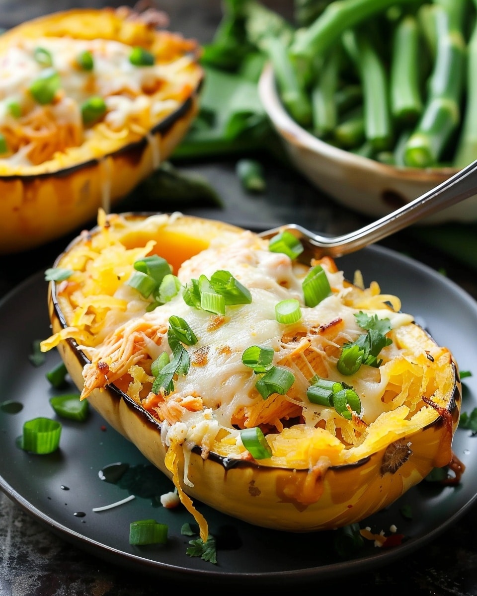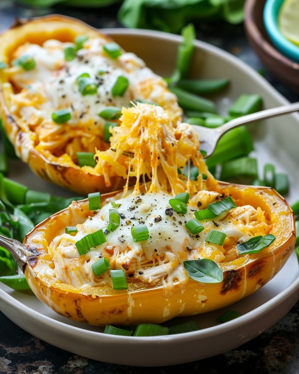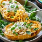 Cheesy buffalo chicken spaghetti squash bowls are a lighter, low-carb alternative to pasta dishes, combining tender roasted squash strands with creamy, spicy buffalo chicken and melted cheese. Served in the squash shells for easy cleanup and fun presentation, they’re comforting, flavorful, and satisfying.