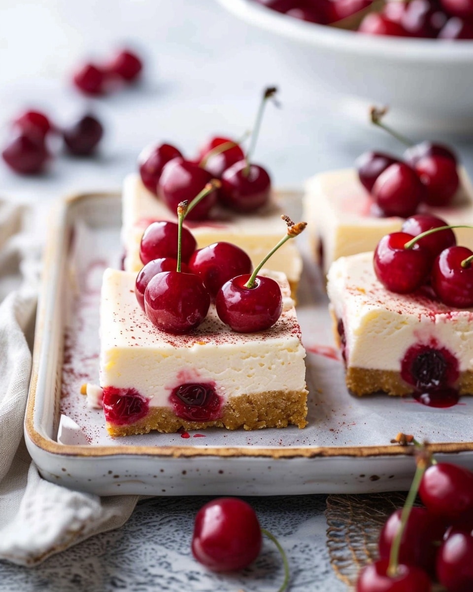 Cherry Cheesecake Bars are a dreamy combination of buttery graham cracker crust, smooth and creamy cheesecake filling, and a glossy cherry topping. These bars offer all the rich flavor of classic cheesecake, but in an easy-to-slice, shareable form.
