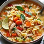 I store leftovers in the fridge for up to 4 days. The noodles can absorb some of the broth, so I keep a little extra broth on hand to add when reheating. I warm it gently on the stove or in the microwave. If I’m planning to freeze it, I cook and store the noodles separately to avoid them getting too soft. The broth and chicken freeze well for up to 3 months.