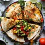 If I have leftovers, I store the quesadillas in the fridge for up to 2 days. To reheat, I crisp them back up in a skillet or toaster oven. The salsa is best fresh, but I keep it in an airtight container for a day or two and stir before serving again.