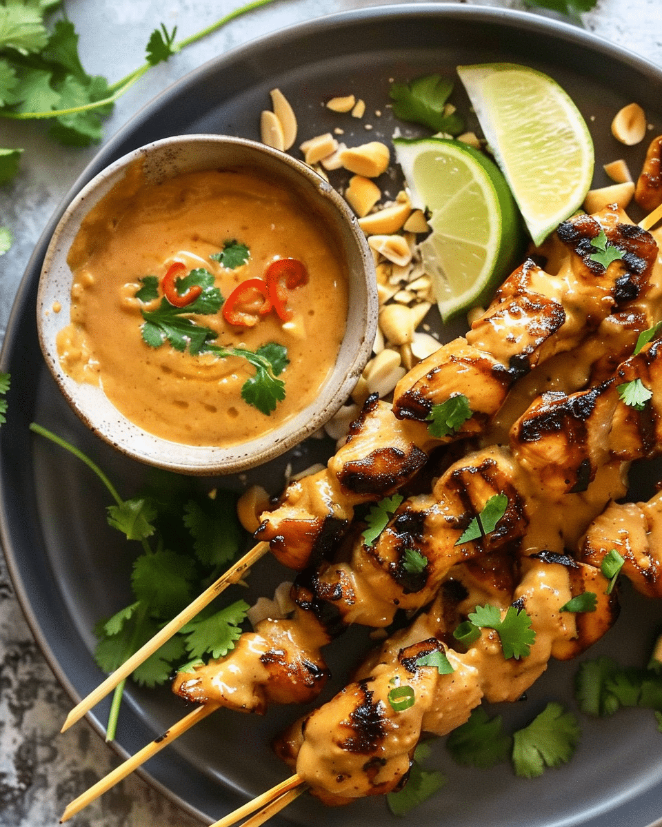 - Serve: Plate the skewers with peanut sauce on the side. Garnish with chopped peanuts, cilantro, or lime wedges if desired.