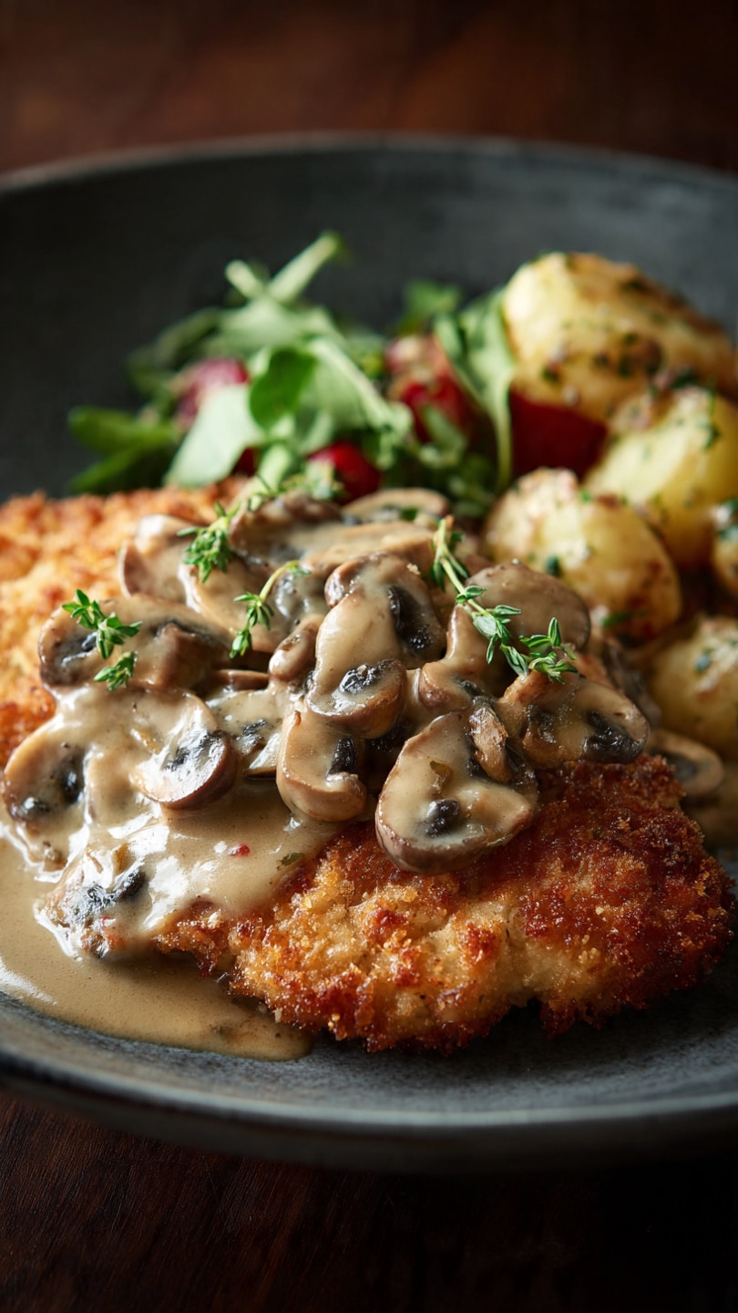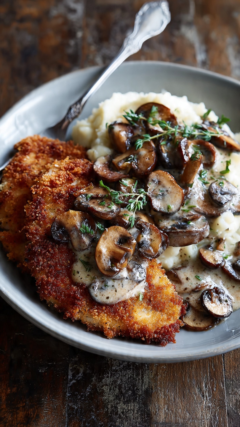 This Chicken Schnitzel with Mushroom Gravy is a comforting, flavorful dish featuring crispy breaded chicken cutlets topped with a rich, savory mushroom sauce. It’s a perfect combination of crunchy and creamy textures, ideal for cozy dinners or entertaining guests.