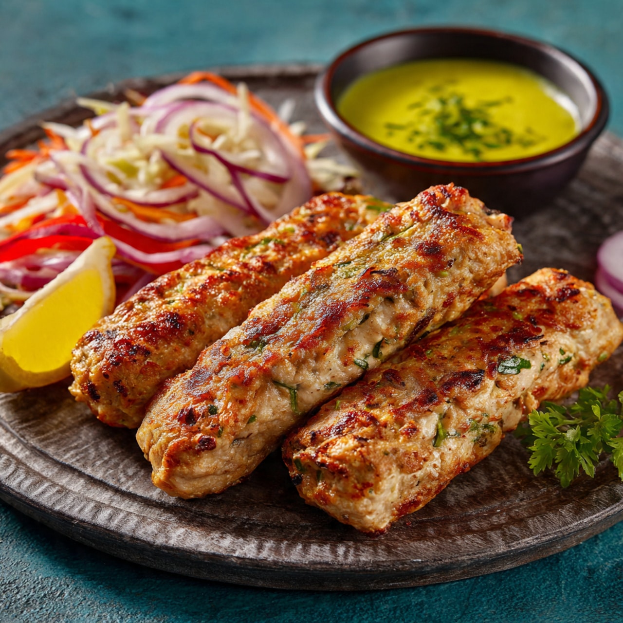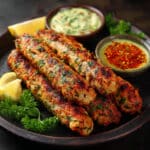 Flavorful chicken seekh kababs made with minced chicken, aromatic spices, herbs, and garlic. These tender and juicy kababs are shaped onto skewers and cooked until lightly charred, making them a delicious South Asian-inspired dish perfect for dinners, gatherings, or snacks.
