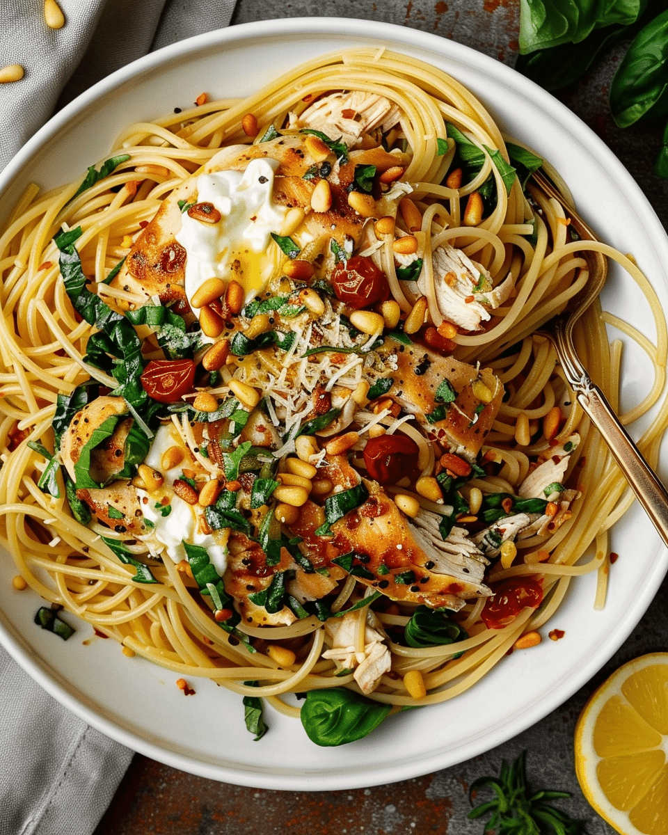 This chicken spaghetti with burrata and lemon butter garlic sauce is a vibrant Italian-inspired pasta dish that combines tender spaghetti, smoky paprika-seasoned chicken, sweet roasted cherry tomatoes, creamy burrata, fresh basil, and crunchy toasted pine nuts. Balanced with bright lemon, rich butter, and aromatic garlic, it’s perfect for both cozy weeknight dinners and elegant entertaining.