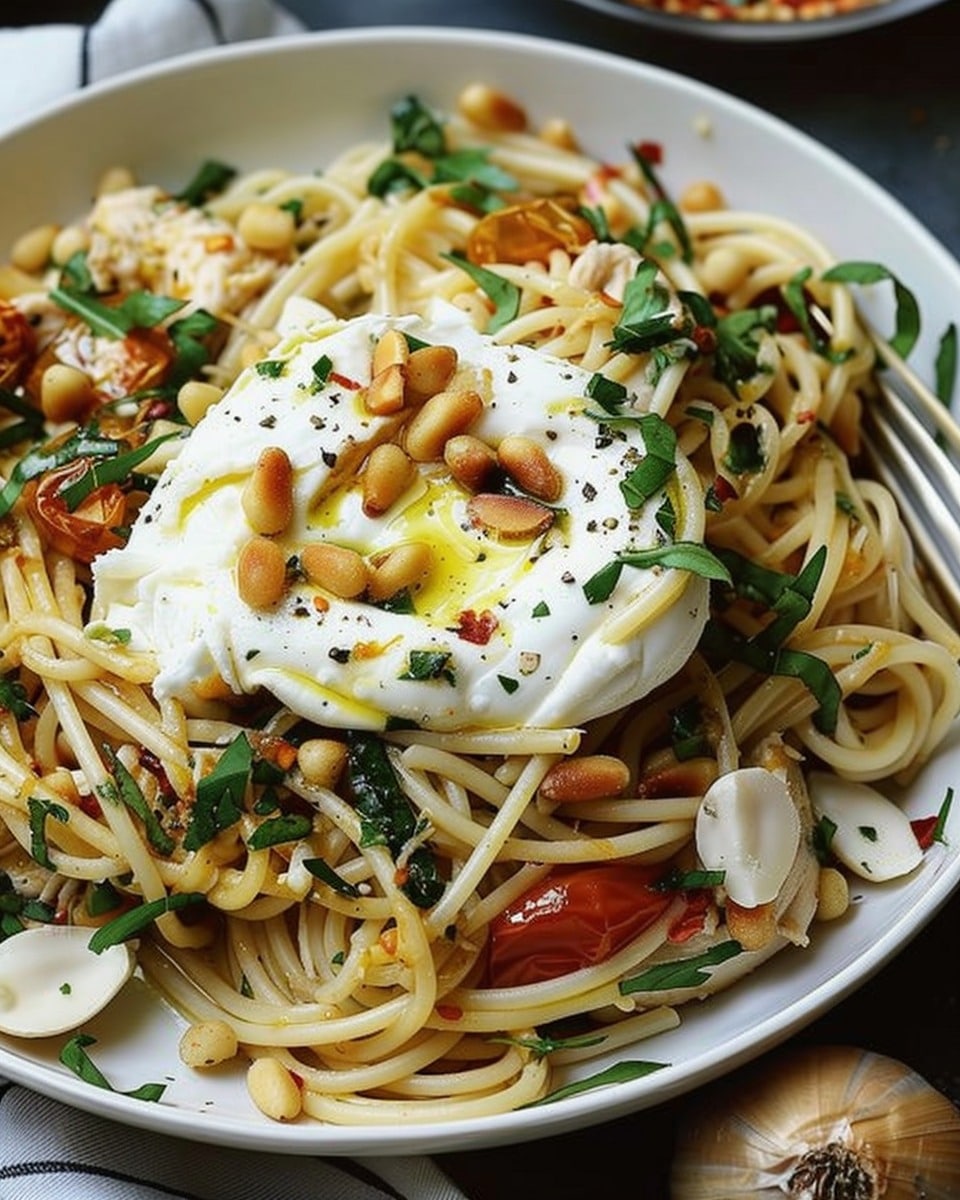 A rich and vibrant pasta dish featuring spaghetti, juicy chicken, creamy burrata, and crunchy toasted pine nuts tossed in a bright lemon butter garlic sauce. Perfect for both weeknight dinners and special occasions.