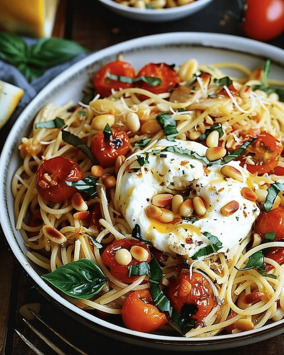 I love how this dish feels like something straight from a cozy Italian bistro, yet it comes together easily in my own kitchen. The tangy sweetness of roasted tomatoes balances the richness of burrata and butter, while the pine nuts add a satisfying crunch. The lemon and garlic tie everything together with a burst of brightness.