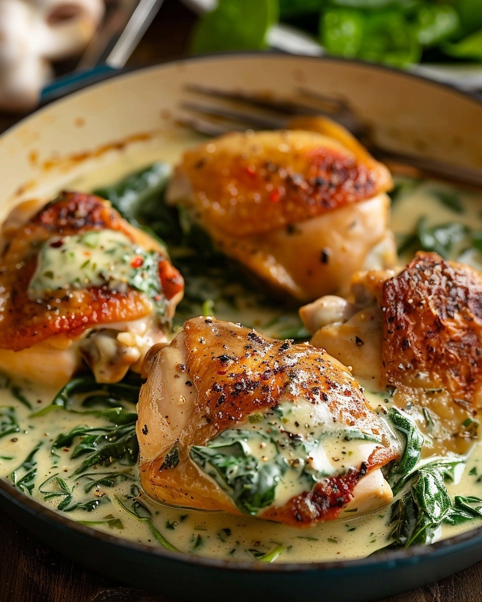 I love this recipe because it’s packed with flavor but comes together quickly in one skillet. The chicken thighs stay moist and tender, while the creamy spinach sauce adds a beautiful balance of richness and freshness. It’s great for weeknights but elegant enough to serve when I’m hosting friends. Plus, it pairs well with just about anything — pasta, rice, or even cauliflower mash.