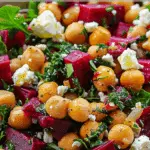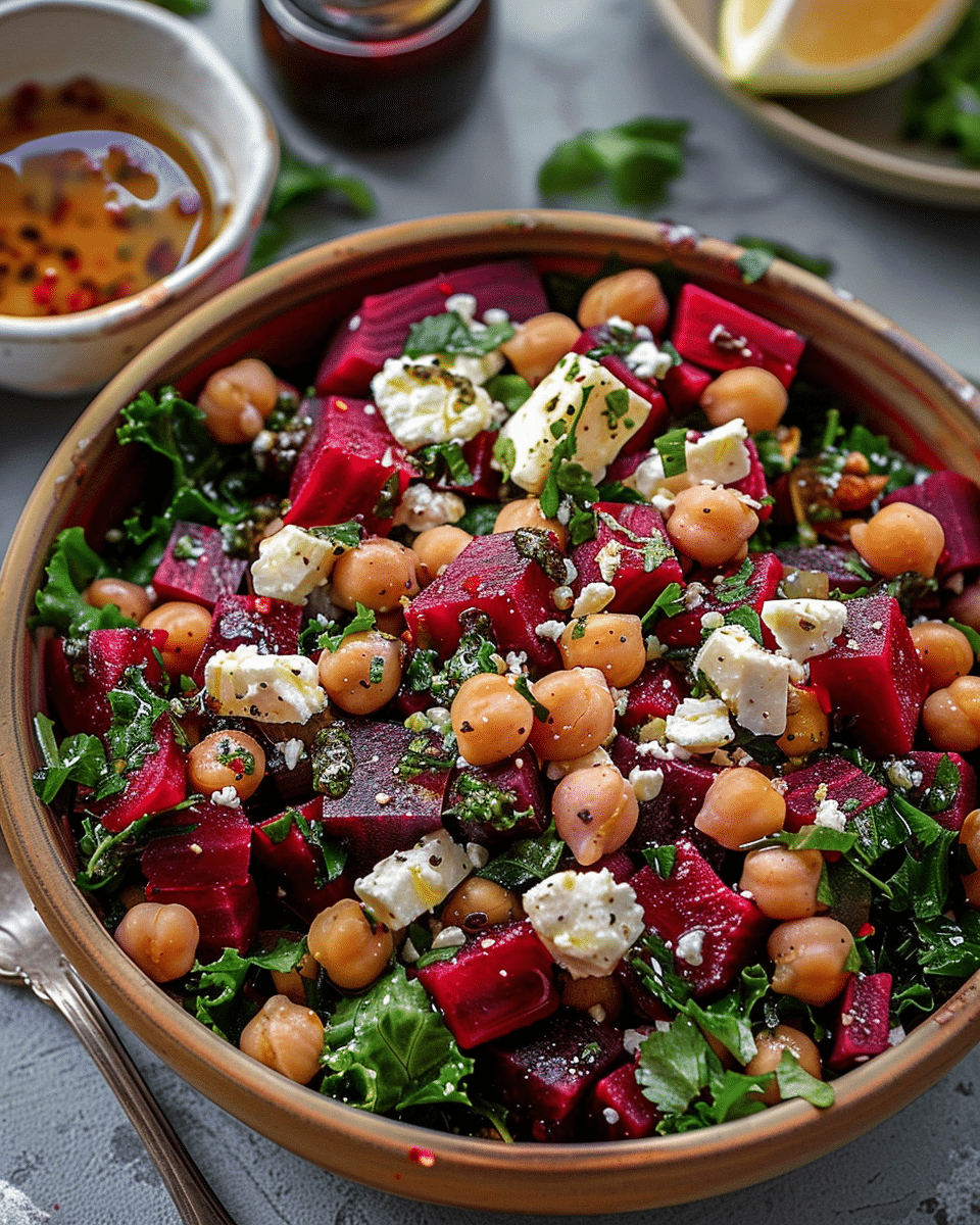 A vibrant and nourishing salad made with chickpeas, roasted beets, feta cheese, and fresh herbs, all tossed in a zesty lemon-garlic vinaigrette. Perfect as a side or light main dish.