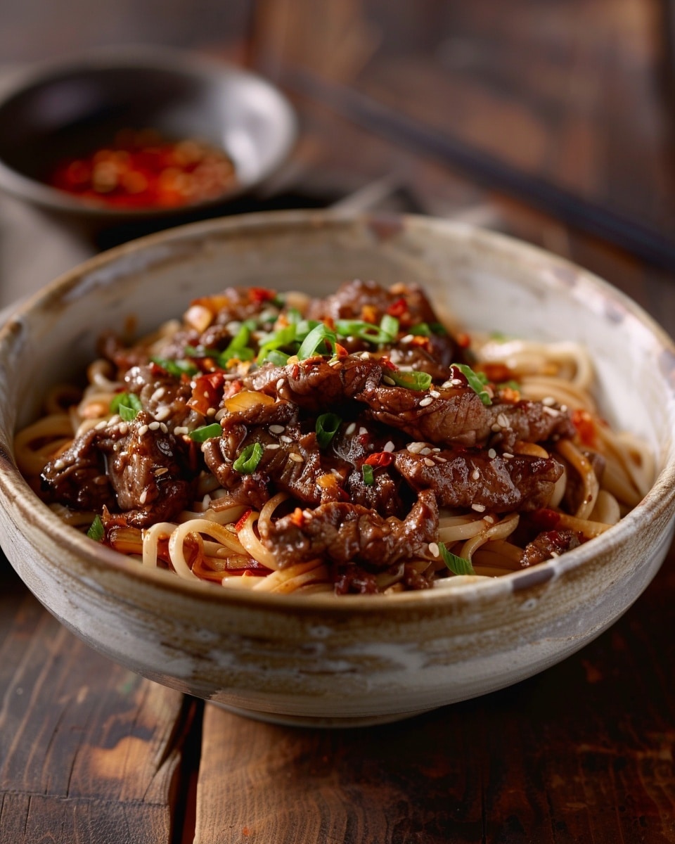 Bold and flavorful Chili Crisp Beef Noodles made with tender strips of beef, perfectly cooked noodles, and a savory, slightly spicy chili crisp sauce. This quick one-pan meal is comforting, satisfying, and packed with rich umami flavor.
